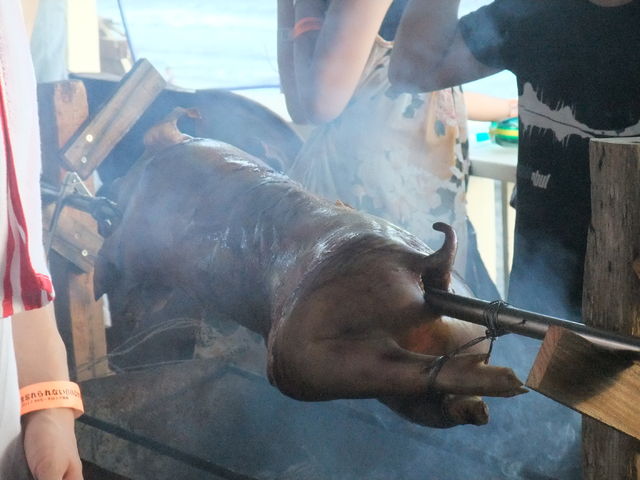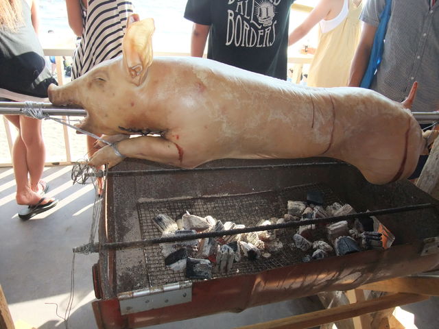 豚の丸焼き。じっくり炭火で。6時間後、美味しく頂きました。