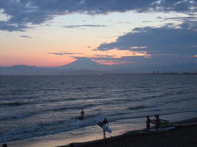 夕暮れ。海の向こうに富士山が見える。